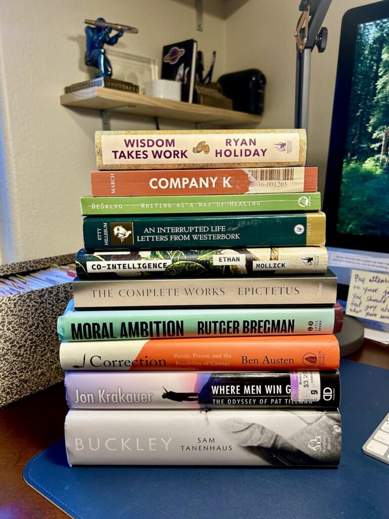 Philosophy as a Way of Life by Piette Hadot, 1984 by George Orwell,The Mind on Fire by Robert D. Richardson, Etty Hillesum: A Life Transformed by Patrick Woodhouse, The Art of Slow Writing by Louise DeSalvo,Fahrenheit 182 by Mark Hoppus, Transcendentalism and the Cultivation of the Soul by Barry M. Andrews, Abundance by Ezra Klein & Derek Thompson, Still Writing by Dani Shapiro, Address Unknown by Kathrine Kressmann Taylor,Writing My Wrongs by Shaka Senghor, The Inner Game of Tennis by W. Timothy Gallwey, How To Think Like Socrates by Donald J. Robertson, Enduring Lives: Living Portraits of Women and Faith in Action by Carol Lee Flinders, The Autobiography of Malcolm X by Malcolm X, The Stranger Beside Me by Ann Rule, How To Be Caring by Shantideva, Lincoln on Leadership by Donald T. Phillips,The Courage To Create by Rollie May,History Matters by David McCullough, American Kings: A Biography of the Quarterback by Seth Wickersham, Socrates by Paul Johnson,With the Old Breed by E. B. Sledge,A Marriage at Sea by Sophie Elmhirst, New Seeds of Contemplation by Thomas Merton, How To Be Caring by Shantideva, and Into the Wild by Jon Krakauer.